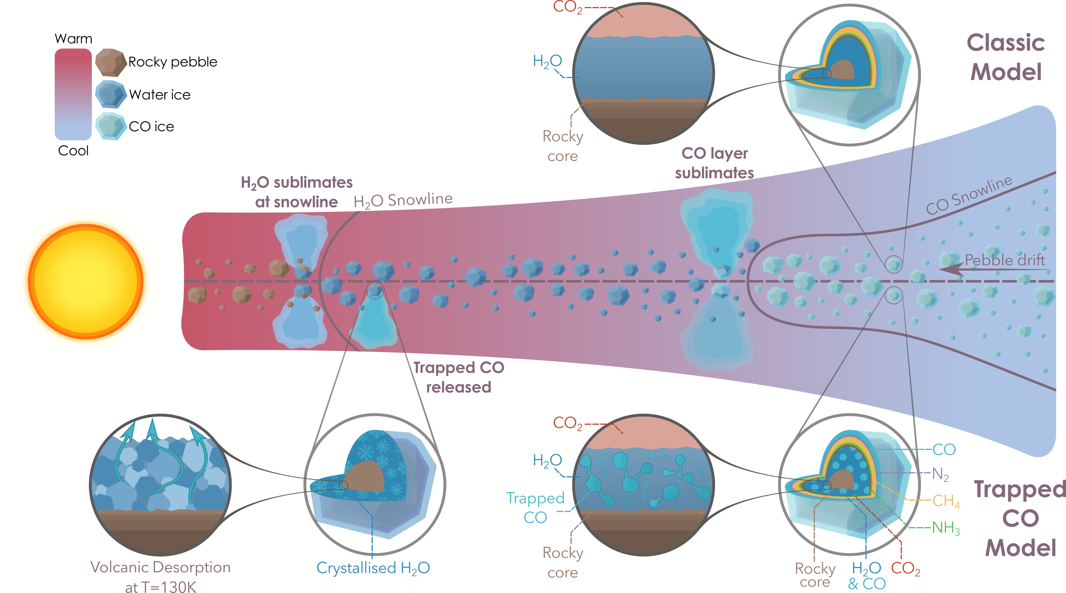 I made this diagram for Figure 1 of Williams et al. 2025, showing how classic pebble drift models contrast with our new volatile entrapment model. Typical volatile transport studies model CO as sublimating at only its snowline at 60-70 au; the entrapment of CO inside water ice, however, means that up to 60% of the CO budget can be released just outside the water snowline due to crystallisation of water ice.