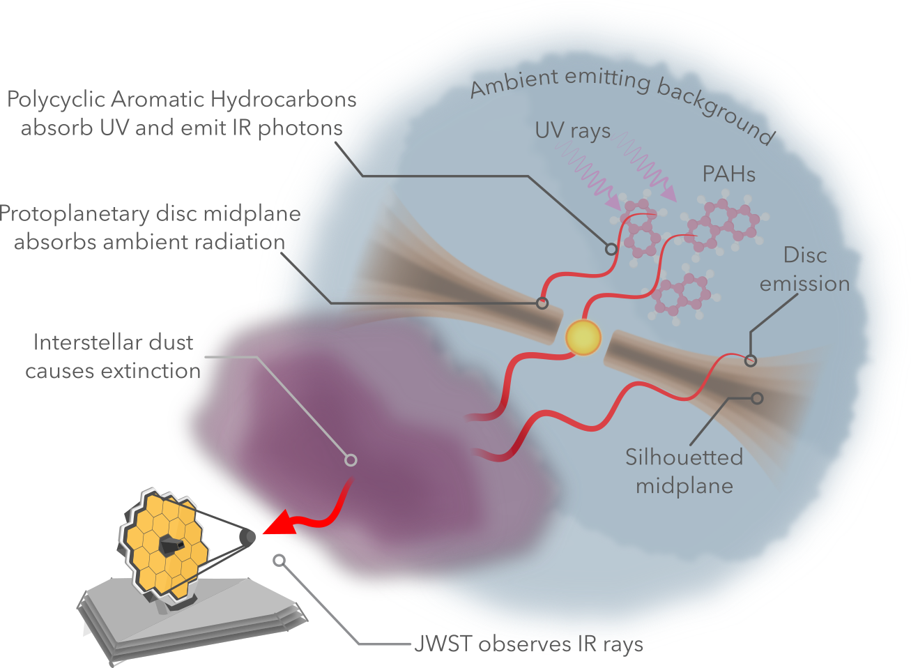 I created this schematic for an Astrobites article I wrote, which details the scenario in which JWST observed the Flying Saucer protoplanetary disc, as outlined by Dartois et al. 2025. This was inspired by their Figure C1.